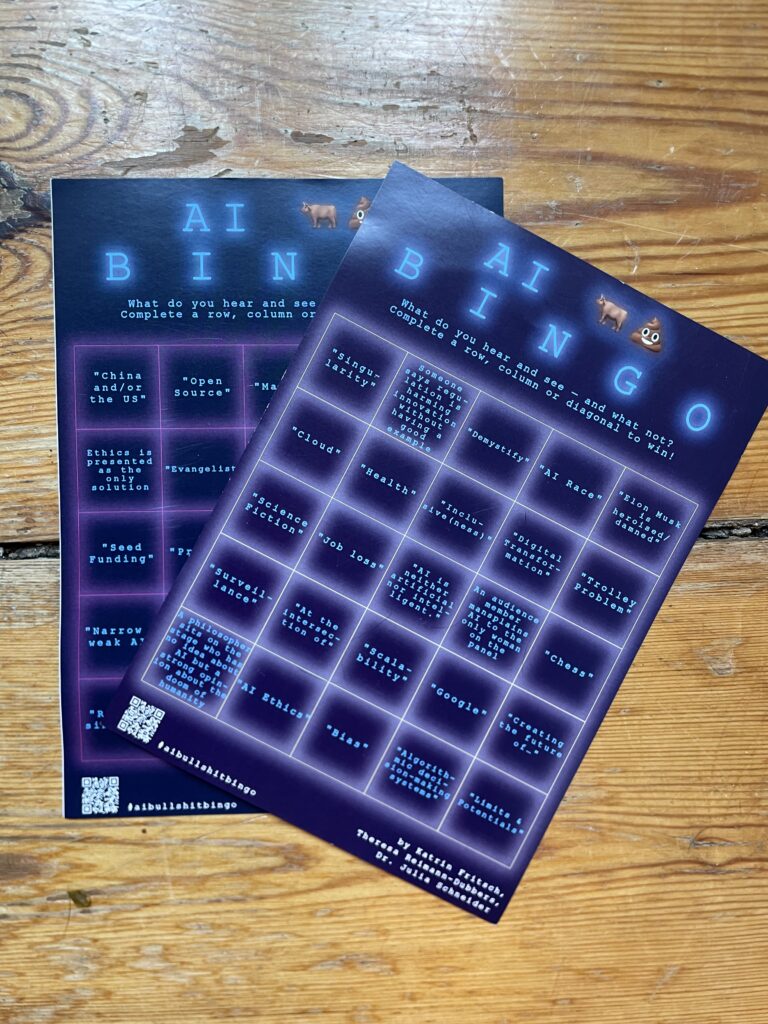>> AI 🐂💩 Bingo ‒- A playful intervention for panels, keynotes and workshops on Artificial Intelligence, with Katrin Fritsch and Theresa Reimann-Dubbers (2022, 4 variations of cards, in English)